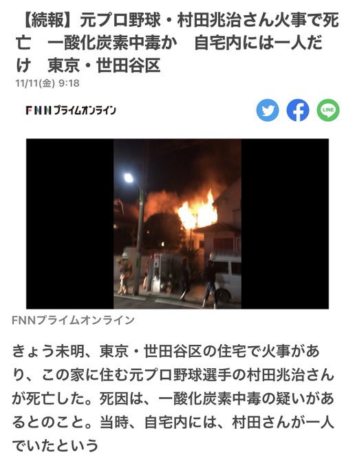3 hours ago先ほど村田兆治さんの死亡が確認されましたということだった. 7 hours ago朝散歩にでたら消防車がいっぱいいた家みて村田さんの家とわかった 警視庁によりますとこの火事で村田兆治さんが意識不明の重体で病院に運ばれ午前6時ごろ死.